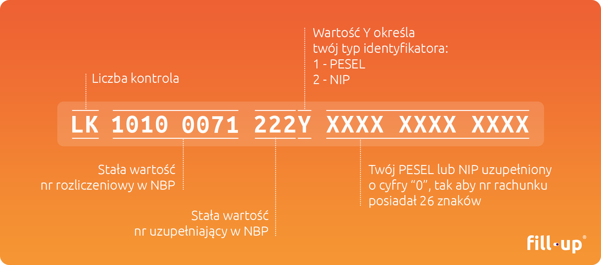 Mikrorachunek, czyli indywidualny rachunek bankowy każdego podatnika przeznaczony do zapłaty podatku PIT, podatku VAT lub podatku CIT, składa się ze stałych części, przy czym jego wyłącznym elementem zmiennym (identyfikującym określoną osobę lub podatnika) będzie numer NIP (poniżej litery X) lub PESEL (poniżej litery Y) podatnika oraz początkowa liczba kontrolna organu podatkowego (LK). W efekcie numer zawsze przedstawia się następująco i w następujący sposób zostanie on wygenerowany dla podatnika: